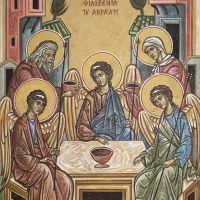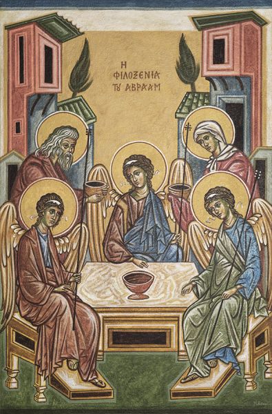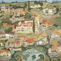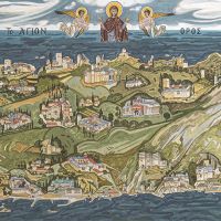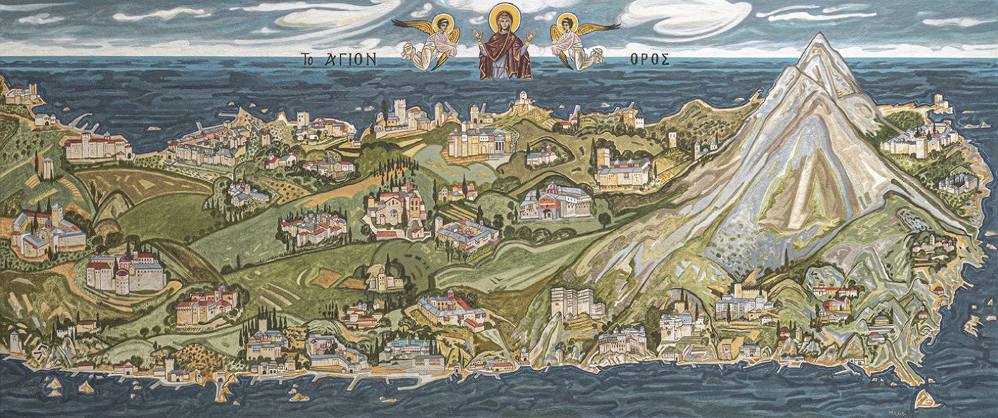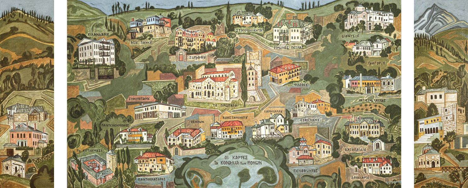 Παράσταση όλης της χερσονήσου του Αγίου Όρους με τις μονές και τις σκήτες, ένα τρίπτυχο των Καρυών, πρωτεύουσας του Αγίου Όρους όπου παρουσιάζονται μόνο τα κτίρια των αντιπροσωπείων των μονών, τα λεγόμενα κονάκια και μια εικόνα της Φιλοξενίας του Αβραάμ