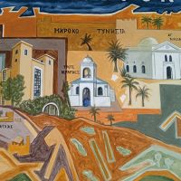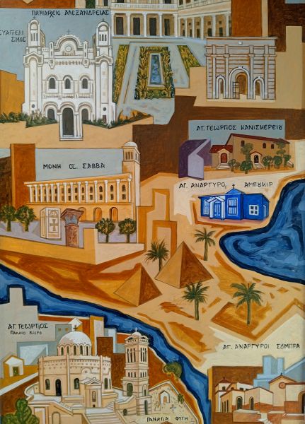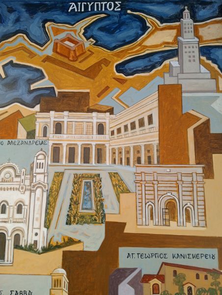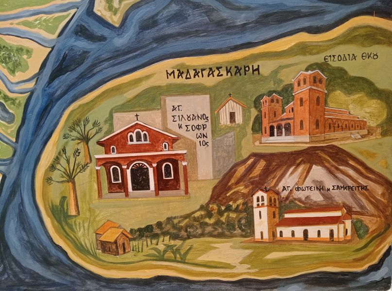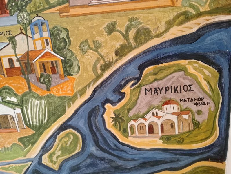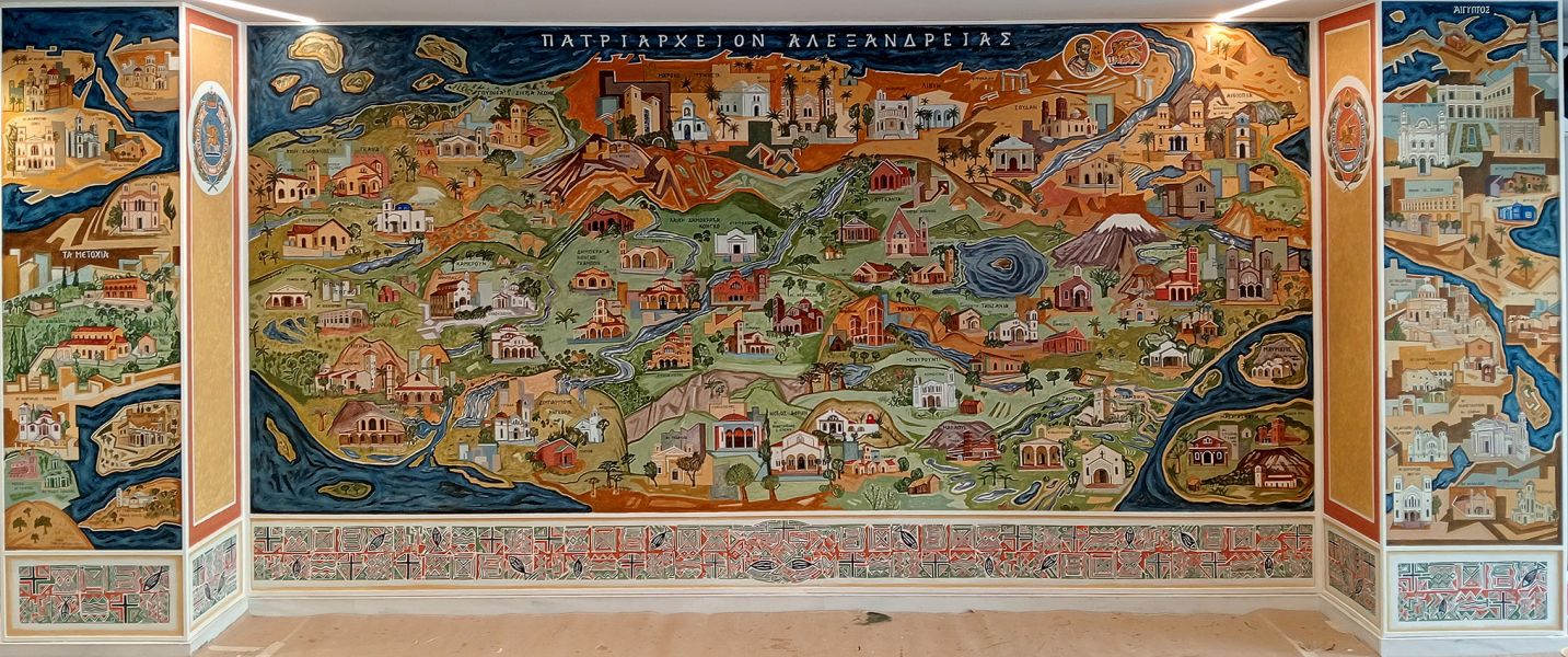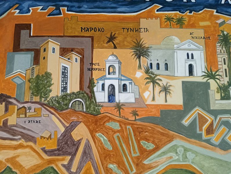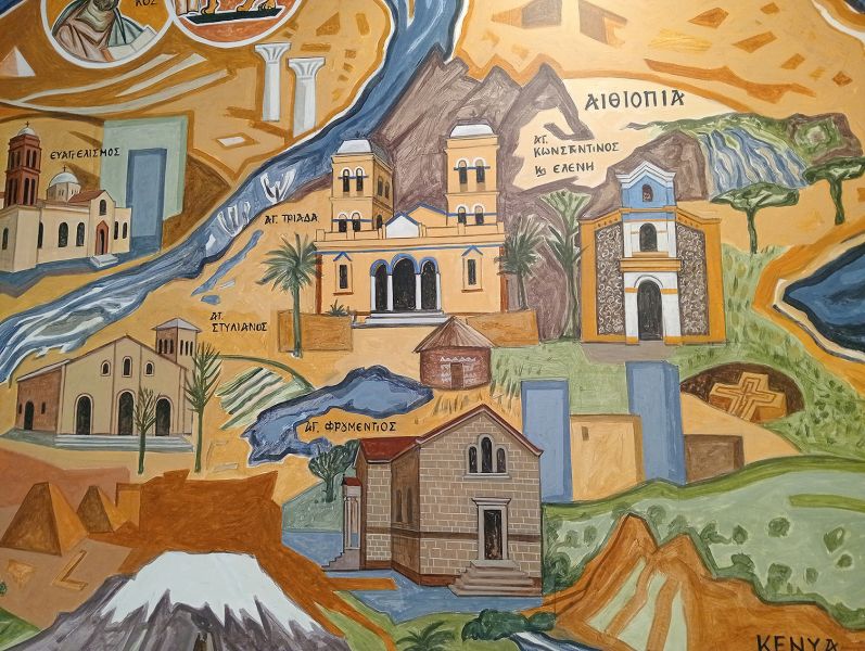 Η τοιχογραφία στη είσοδο παριστάνει μια επιλογή από όλες τους ορθόδοξους ναούς στην Αφρική δικαιοδοσίας του Πατριαρχείου Αλεξανδρείας και Πάσης Αφρικής. Ζωγραφίστηκε με ακρυλικά χρώματα. Το έργο χρηματοδοτήθηκε από την Αστική μη Κερδοσκοπική Εταιρία Πολιτιστικού και Κοινωφελούς Έργου ΑΙΓΕΑΣ.