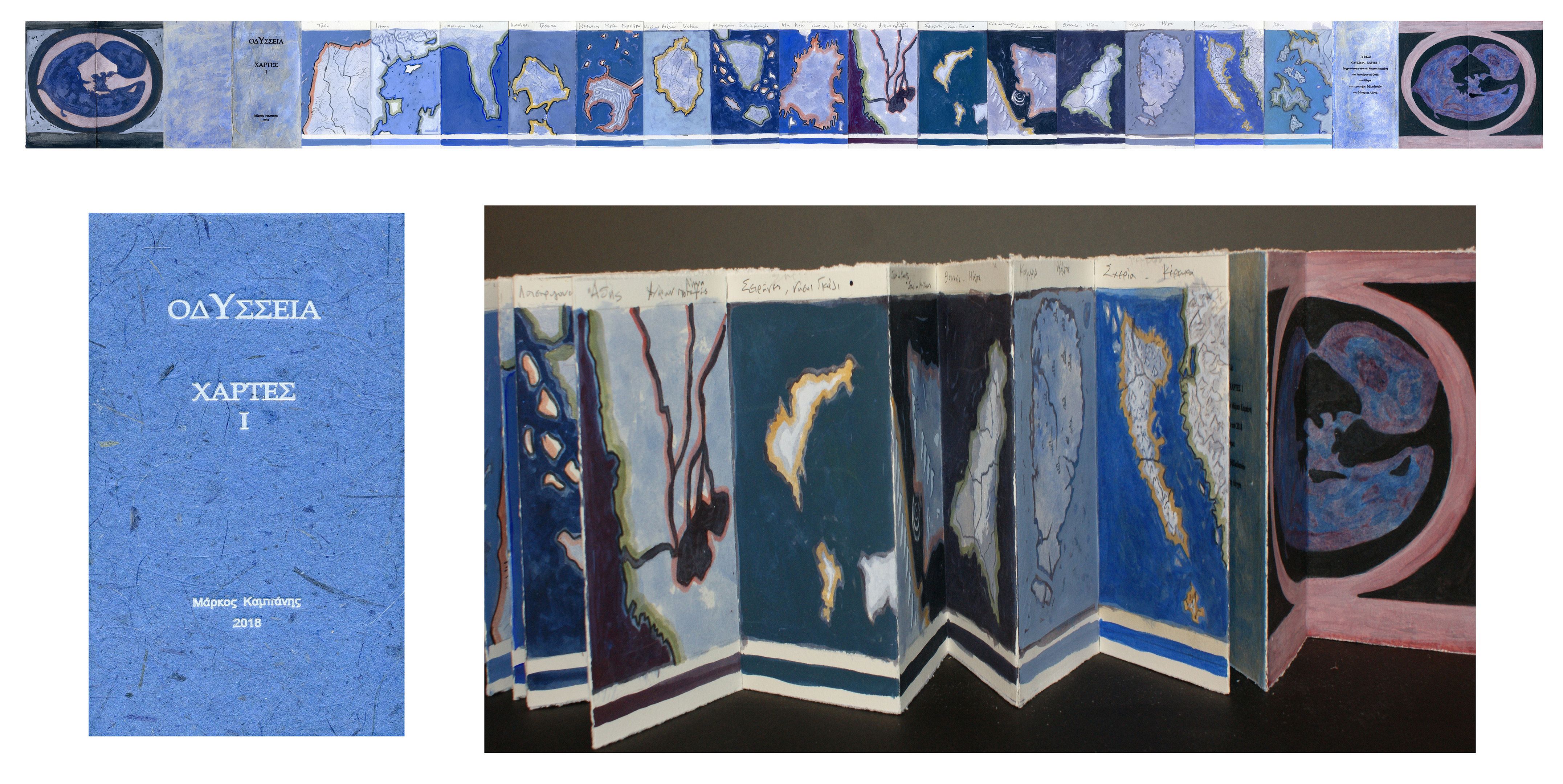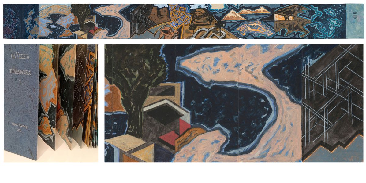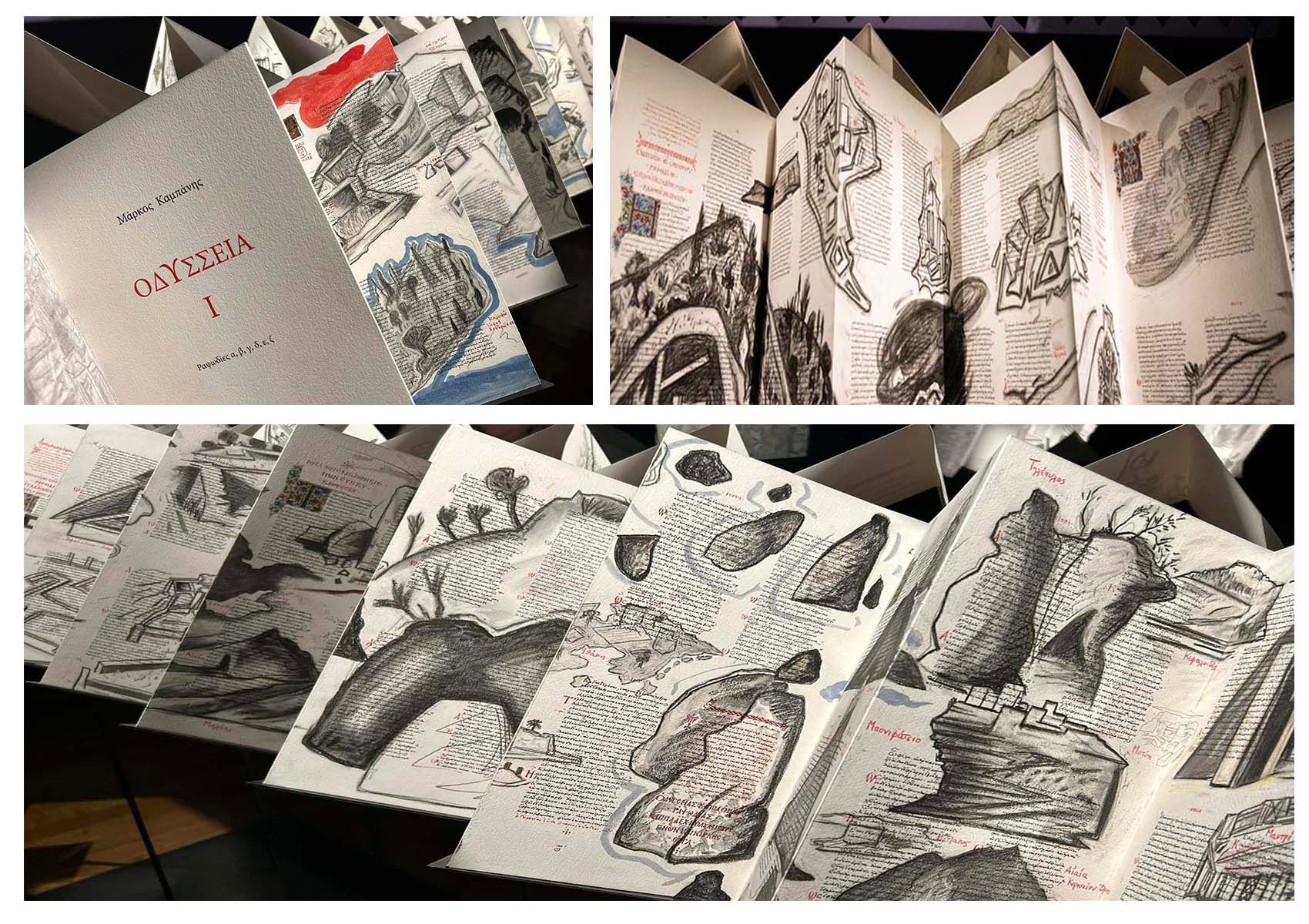Το κεντρικό έκθεμα είναι ένα έργο - βιβλίο τεσσάρων τόμων που δημιούργησε ο Μ. Κ. ζωγραφίζοντας με κάρβουνο και ακρυλικό πάνω σε ψηφιακή ανατύπωση του χειρόγραφου Harley MS 6325 του 15ου αιώνα, το οποίο ανήκει στη Βρετανική Βιβλιοθήκη. Πολλά έργα είναι επίσης στη μορφή ζωγραφισμένου βιβλίου που κάθε ένα σχετίζεται με μια συγκεκριμένη αφήγηση ή ραψωδία του έπους. ενώ Ζωγραφική βασισμένη σε πραγματικούς ή επινοημένους χάρτες της πορείας του Οδυσσέα και του Τηλέμαχου συμπληρώνουν την σειρά των έργων.