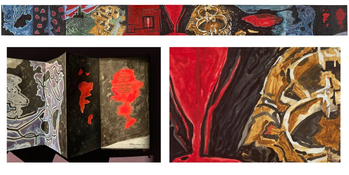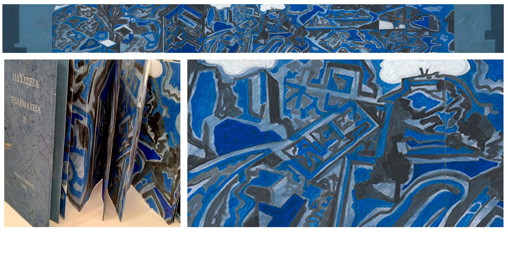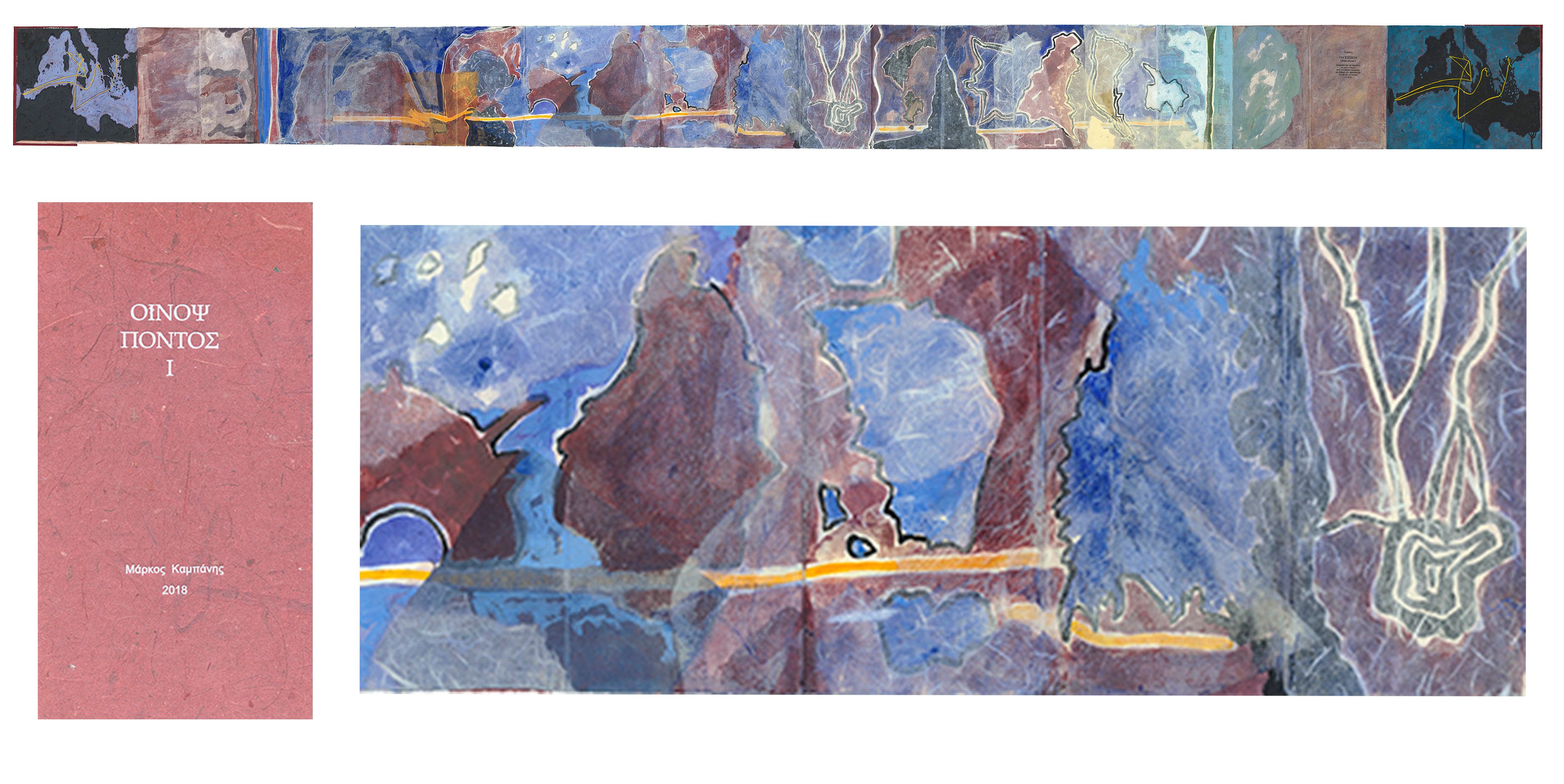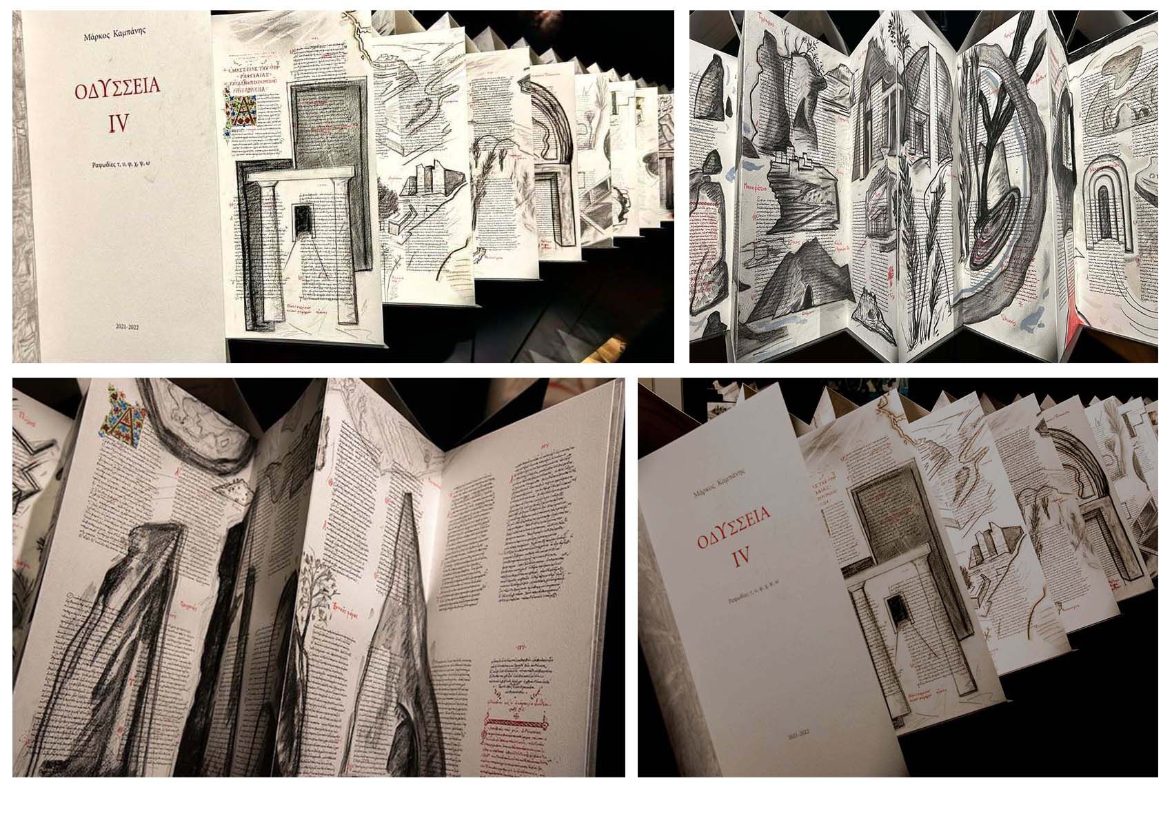 Το κεντρικό έκθεμα είναι ένα έργο - βιβλίο τεσσάρων τόμων που δημιούργησε ο Μ. Κ. ζωγραφίζοντας με κάρβουνο και ακρυλικό πάνω σε ψηφιακή ανατύπωση του χειρόγραφου Harley MS 6325 του 15ου αιώνα, το οποίο ανήκει στη Βρετανική Βιβλιοθήκη. Πολλά έργα είναι επίσης στη μορφή ζωγραφισμένου βιβλίου που κάθε ένα σχετίζεται με μια συγκεκριμένη αφήγηση ή ραψωδία του έπους. ενώ Ζωγραφική βασισμένη σε πραγματικούς ή επινοημένους χάρτες της πορείας του Οδυσσέα και του Τηλέμαχου συμπληρώνουν την σειρά των έργων.